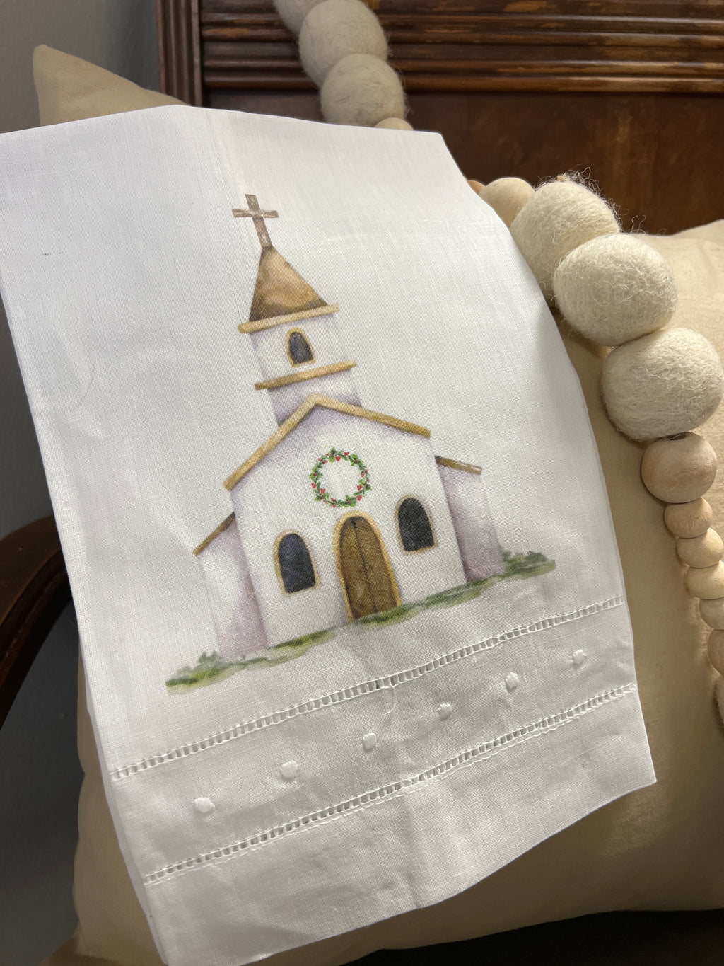 White Church w/wreath tea towel